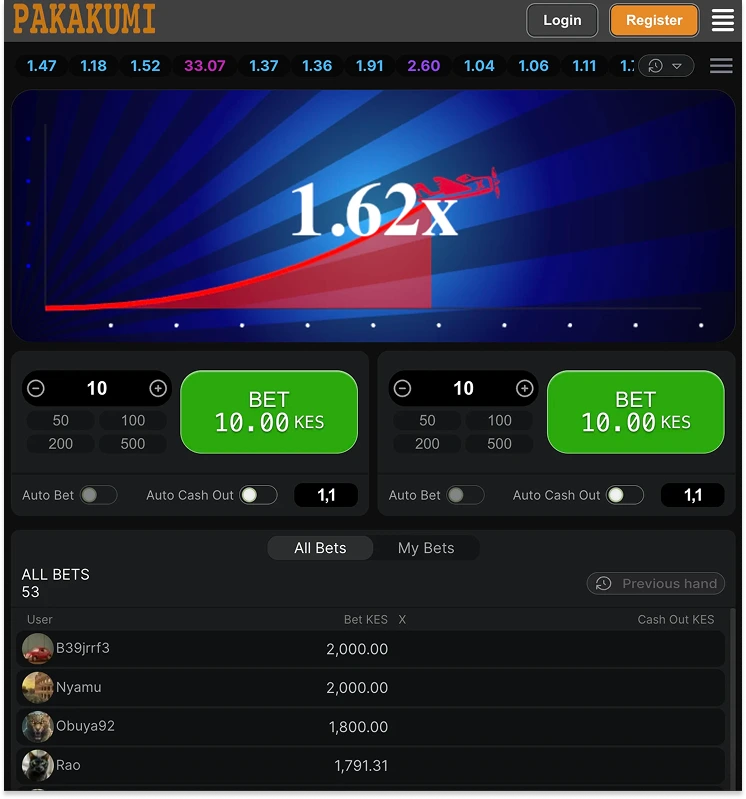 So, if Pakakumi doesn’t have the official Aviator game, what does it offer? Pakakumi has its own crash game. Instead of a plane, the Pakakumi crash game features a rising line chart or graph. The principle is the same: you bet on the graph and must cash out before it “busts” or crashes.